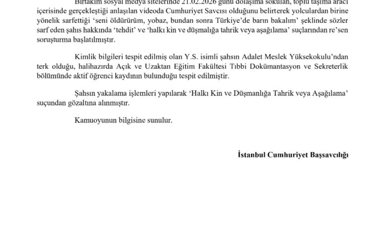 21 Şubat 2026 tarihinde sosyal medya platformlarında paylaşılan görüntülerde, şüpheli şahsın bir yolcuya yönelik “seni öldürürüm, yobaz, bundan sonra Türkiye’de barın bakalım” şeklinde ifadeler kullandığı belirtildi. İstanbul Cumhuriyet Başsavcılığı, söz konusu kişi hakkında “tehdit” ile “halkı kin ve düşmanlığa tahrik veya aşağılama” suçlarından resen soruşturma başlatıldığını duyurdu.