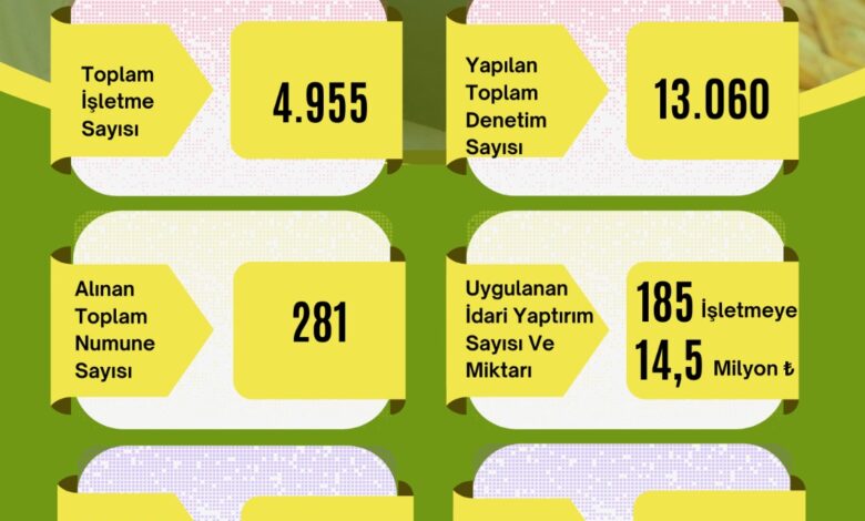 Malatya genelinde 4.955 üretim, satış ve toplu tüketim işletmesine 2025 yılı içerisinde 13.060 denetim gerçekleştirildi. Bu denetimler kapsamında 281 numune alındı; mevzuata aykırı uygulama tespit edilen 185 işletmeye toplam 14.967.000 TL idari para cezası uygulandı.