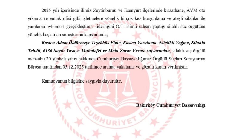 İstanbul’un Zeytinburnu ve Esenyurt ilçelerinde 2025 yılı boyunca işlenen çok sayıda kurşunlama, silahlı saldırı ve yaralama olaylarına ilişkin yürütülen soruşturmada önemli bir gelişme yaşandı. Bakırköy Cumhuriyet Başsavcılığı, söz konusu eylemleri organize ettiği belirlenen ve liderliğini Ö.T. isimli şahsın yaptığı silahlı suç örgütüne yönelik geniş çaplı operasyon başlattı.
