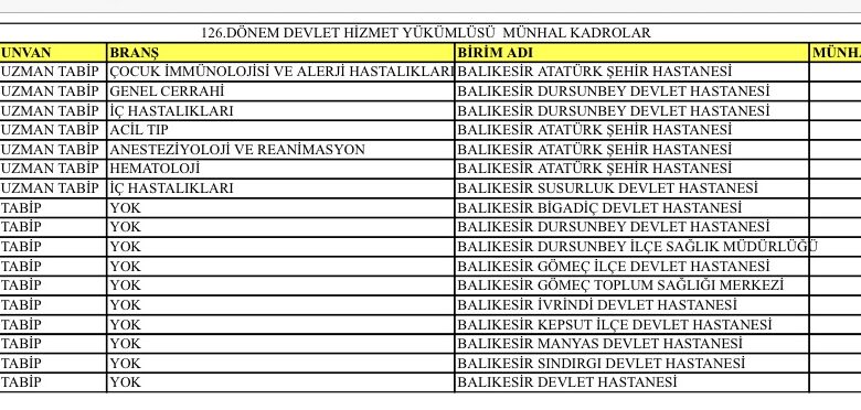 DHY Kurası kapsamında Balıkesir’e ataması yapılan uzman hekimlerin branşları şu şekilde açıklandı: